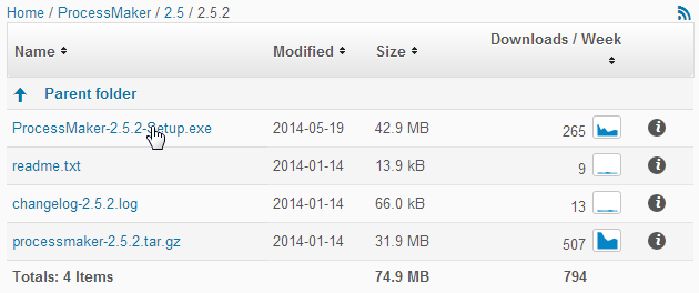 Download ProcessMaker-2.X.X-Setup.exe from http://sourceforge.net/projects/processmaker/files. ProcessMaker versions are labeled according to the pattern MAJOR.MINOR.REVISION, such as 2.5.1, where 2 is the major version, 5 is the minor version and 1 is the revision number. It is recommended to download the most recent version of ProcessMaker under the 2.5 folder.