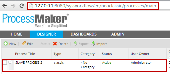 To verify that the second connection is working, let's access ProcessMaker and view all processes created in the DESIGNER: