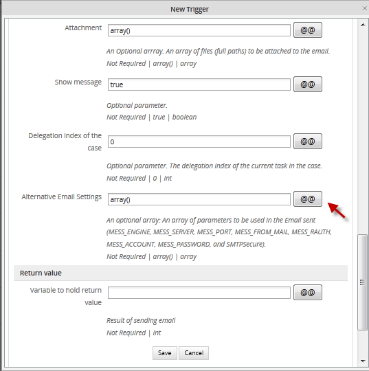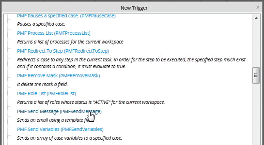 To create a trigger which sends out an email from a custom email server and/or user account, go to DESIGNER and open a process for editing. Then, go to the Triggers tab and click on New. Then select ProcessMaker Functions and click on the PMFSendMessage() in the list: