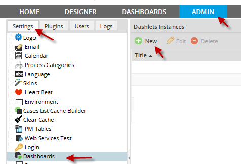To create a dashlet go to Dashboards option inside ADMIN > Settings and click on New: