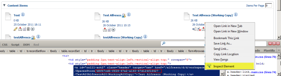 - To execute some triggers, Id of Files or Folders will be required, to get the ID of the them,it is recommended using web development tool like Firebug of Firefox, just right click over the name of the File/Folder, choose Inspect element and on the bottom side a link will display, on this link the id will be referenced, just copy it as the image below: