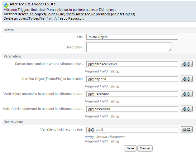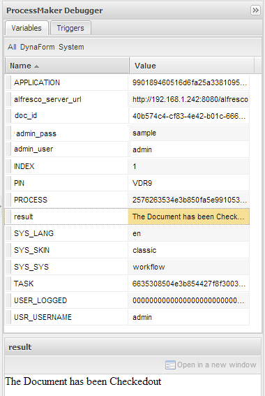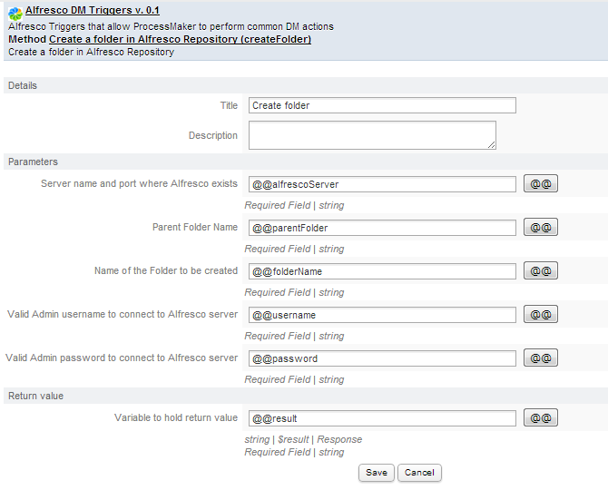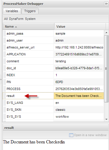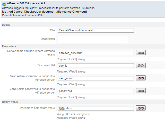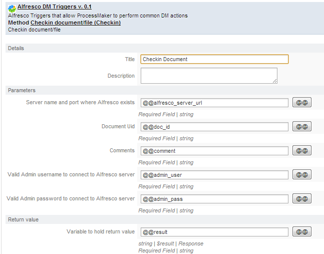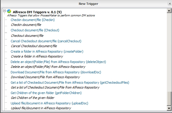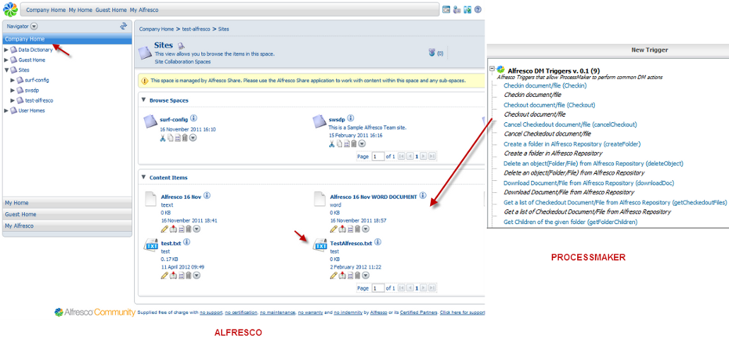 The integration between Alfresco and ProcessMaker, brings the possibility to manage the Alfresco environment; for this purpose many triggers may be created on ProcessMaker, which modify behavior of Alfresco content