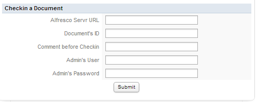 - pwd: Valid Admin password to connect to Alfresco server