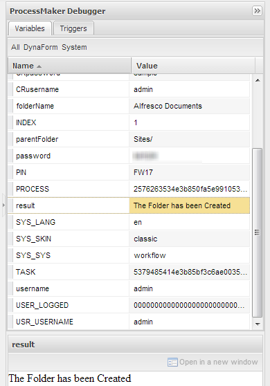 Click on Submit, and check ProcessMaker Debugger, result variable must show The folder has been created message: