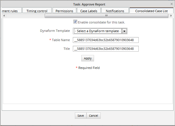 • Dynaform template: choose the dynaform template which will be used to generate the batch derivation. Dynaform template will be a grid, all grids created in the process will be listed. Note that for each grid selected as a template a report table will create with the same information of the grid