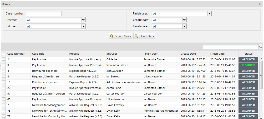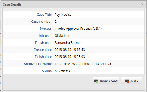 In running systems, where a lot of information is manipulated every day, data is very important to be consulted, but not all data is required to be stored in the database, specially old data. That's why, old information is archived to get historical data. In past version of ProcessMaker, cases can't be archived.