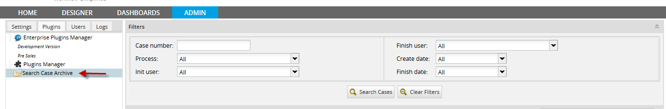 All archived cases will be listed under Admin > plugins > Search Case archive option. There you will have the following interface: