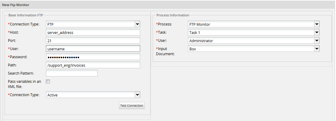 In version 1.4.23 and later, there is a new interface to define an FTP monitor connection which divides the form in two sections and provides a Test connection button to check whether the connection is correct: