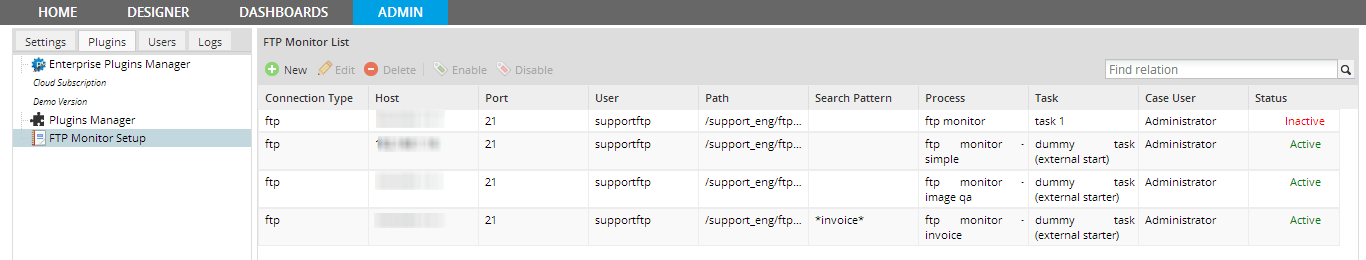 - Login with a user such as "admin" who has the PM_SETUPADVANCE permission in his/her role and then go to ADMIN > Plugins > Enterprise Manager. Either install the FTP Monitor plugin by clicking on