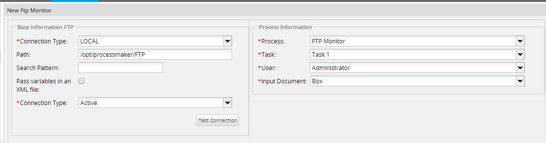 Follow this example if the FTP Monitor starts cases by using files placed a local directory in the server where ProcessMaker is installed. Follow the steps below in order to create cases using a Local connection.