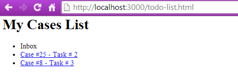 Once the request has been accepted, this page will display the Inbox, which is a list of TO DO cases which are assigned to the logged-in user. Create the caselister/todo-list.html file with the following content: