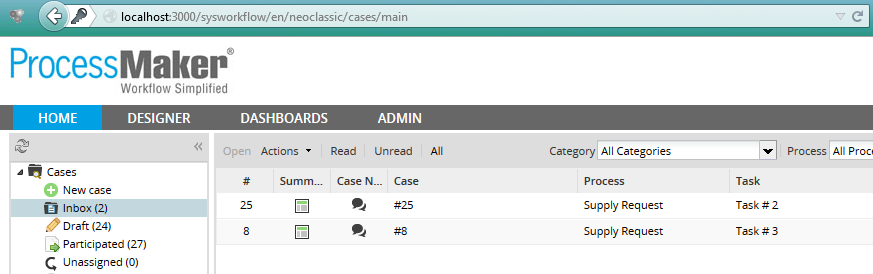 Remember that those cases are coming from the ProcessMaker instance defined in the app.js file. By going to that ProcessMaker instance, the same cases as we were listed in the application, must be listed: