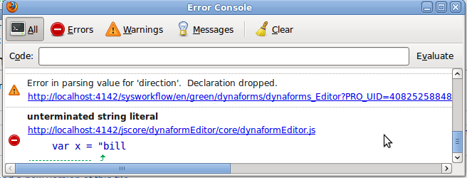 DynaForms currently generate many warning messages when displayed, but these warnings can be safely ignored. To only see the warnings and errors caused by your custom code, view the DynaForm by clicking on the Preview tab in the DynaForm Editor. Then, open the Error Console and clear the warnings by clicking on the "Clear" button. Then, click on theJavaScript tab and then click back on the Preview tab to get the JavaScript to only execute only your custom code (but not reload the DynaForm again).