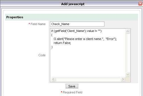 For example, to get the contents of a field named "ClientName" and assign it to a JavaScript variable named "client":