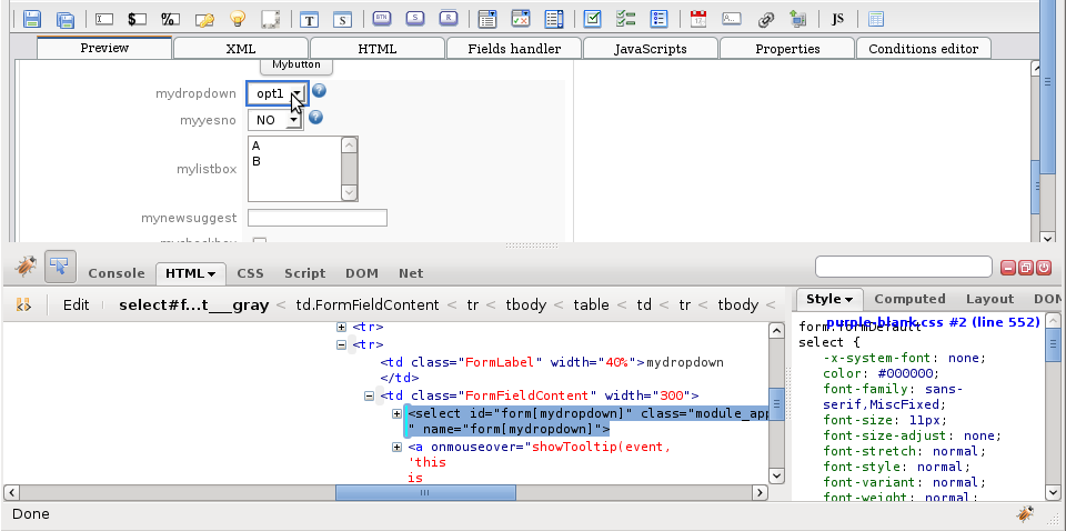 Firebug can also be used to discover the structure and elements of a DynaForm. For example, to find the ID or class name of a field in a DynaForm, turn on Firebox by pressing F12 or by clicking on the Firebug icon in the status bar and then pressing CTL+SHIFT+C or by clicking on the "Inspect Element" button in Firebug's toolbar. Then position the mouse over the element in the DynaForm to see its HTML code.
