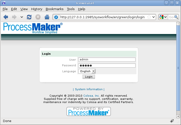 Now it should be possible to login into the different installations of ProcessMaker, at different IP addresses or port numbers. For the above example, login at http://localhost for the previous installation and at http://localhost:2052 for the new installation. Bold text