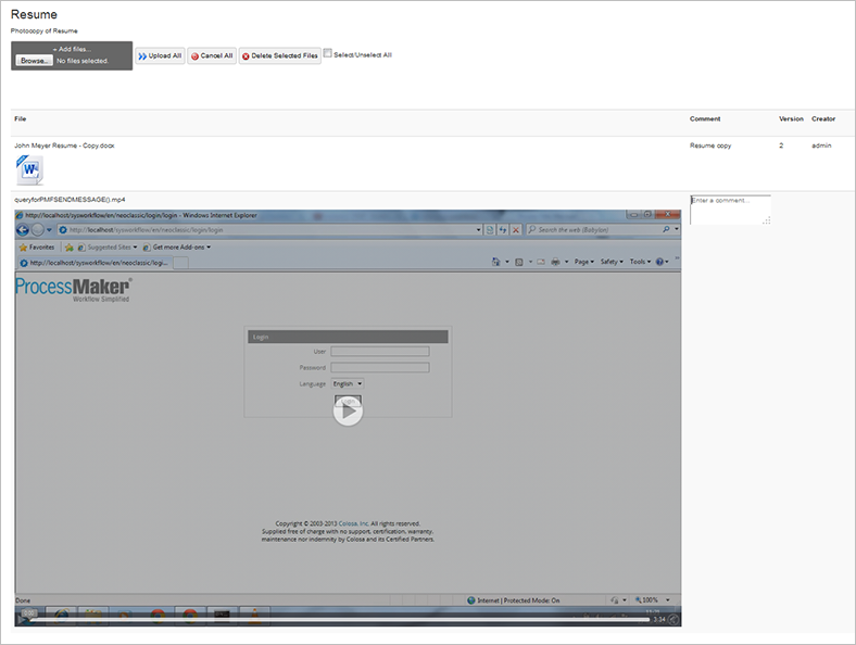 The Multiple Input Document Uploader is a plugin designed to upload one or more documents at the same time by using a user-friendly interface. When the plugin is enabled, a new interface is used for uploading, adding comments and deleting multiple files at the same time. When a file is uploaded as an Input Document, a progress bar is displayed to show what percentage of the file has been uploaded. The interface provides a preview of image files, as well as buttons to delete or cancel the upload of multiple documents at the same time.