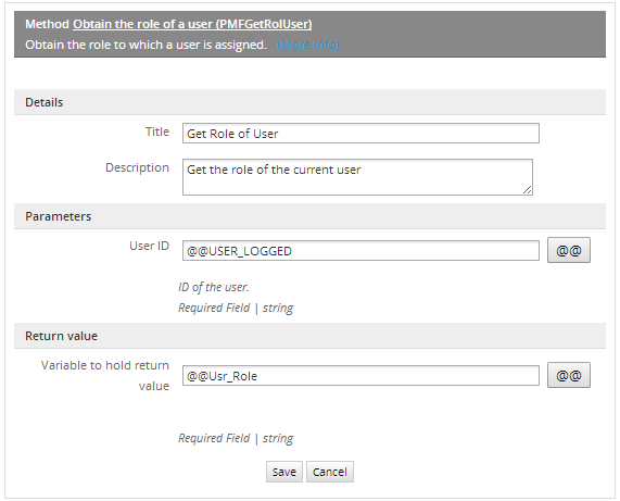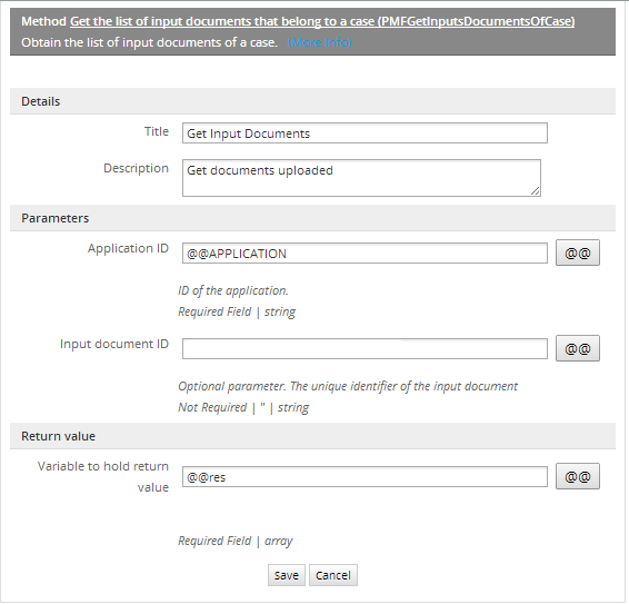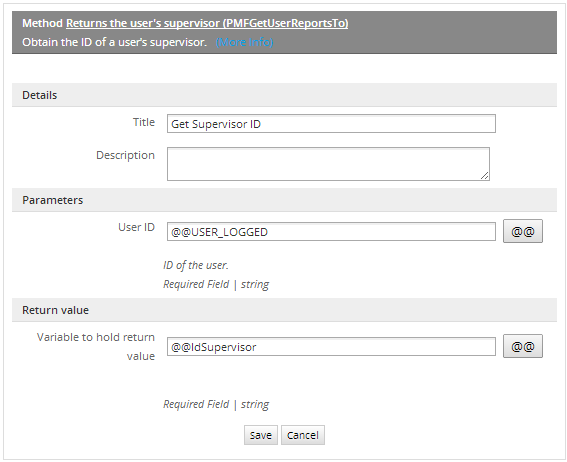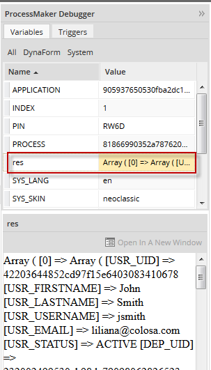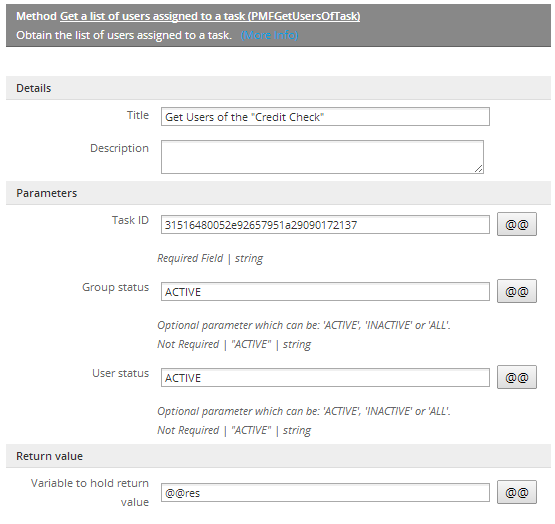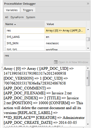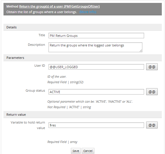 - string proUid: Optional parameter. The unique ID of the process. To get the unique ID of the current process, use the @@PROCESS system variable.