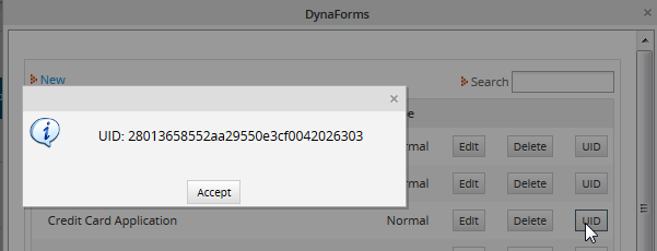 - string dynUid: Optional parameter. The unique ID of the master DynaForm which contains the grid. To get this ID, open the process for editing, click on DYNAFORMS in the top bar and in the list click on the UID button for the DynaForm.