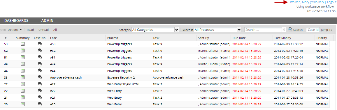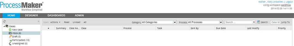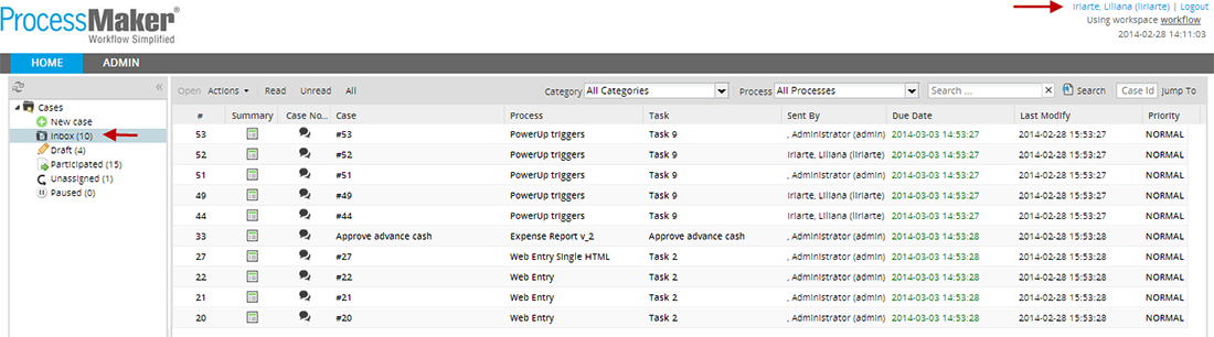 Step 3: Make sure you have pending cases for the users you are going to use. We will use two users, Mary Walker and Liliana Iriarte. Logging with Mary Walker user and go to her inbox we will see 10 cases: