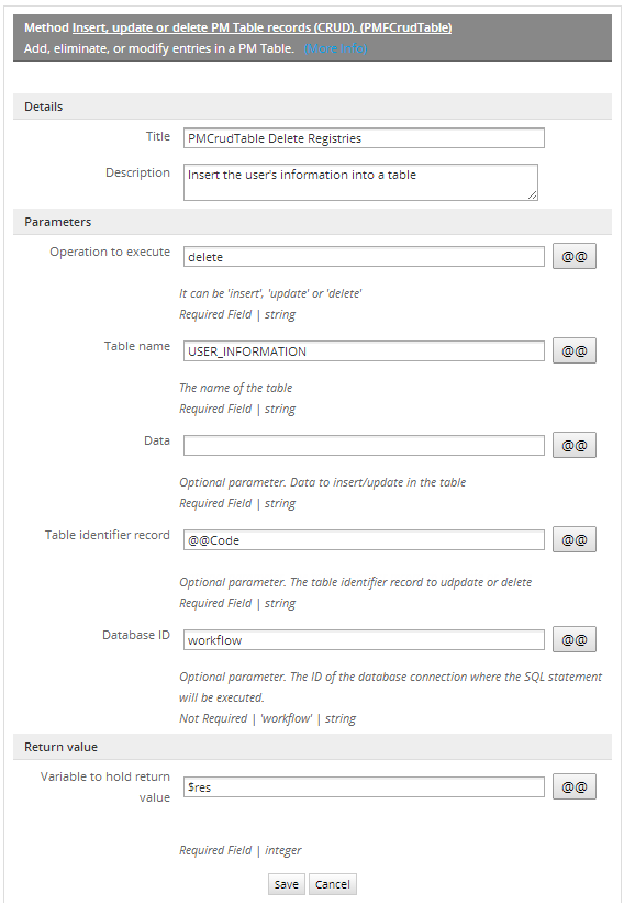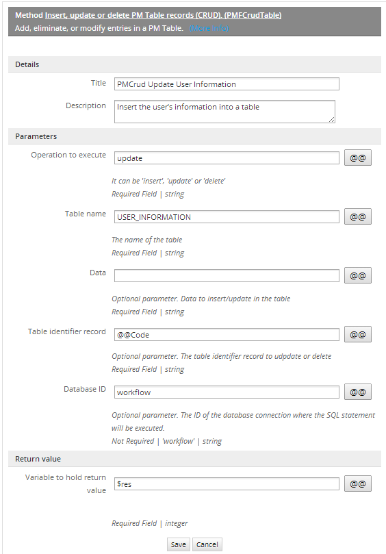 $res = PMFCrudTable('update', 'USER_INFORMATION', $data, @@Code, 'workflow');