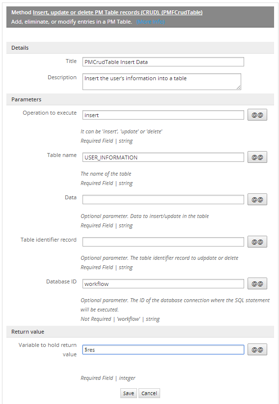 $res = PMFCrudTable('insert', 'USER_INFORMATION', $data, 'workflow');