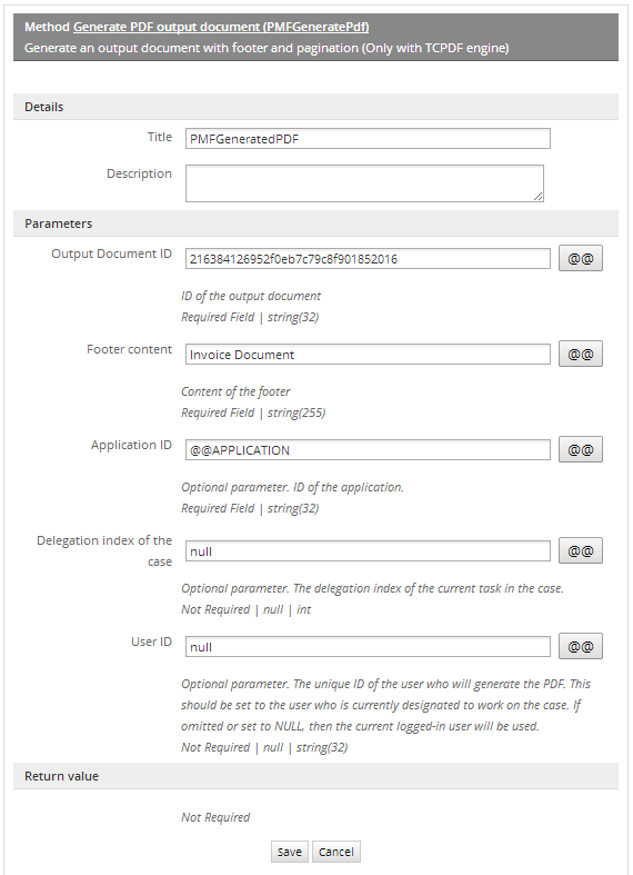 - string footerContent The content of the footer which will be placed at the end of the document. It must be enclosed in single quotes, i.e.: 'ProcessMaker Documentation'