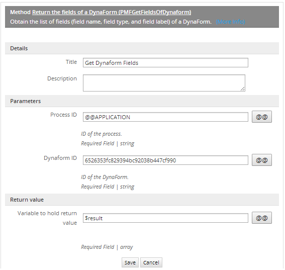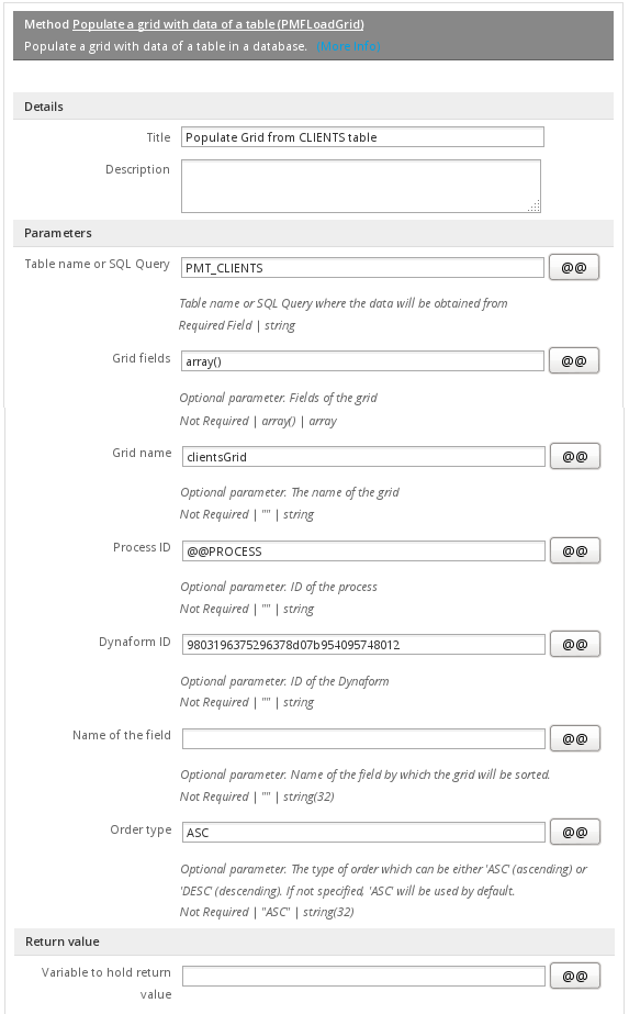 The return value of the PMFLoadGrid() function is assigned to a case variable which has the same name as the field in the master DynaForm which holds the grid. In this case, the list of field names don't need to be defined, since they will be retrieving from the definition of the grid.