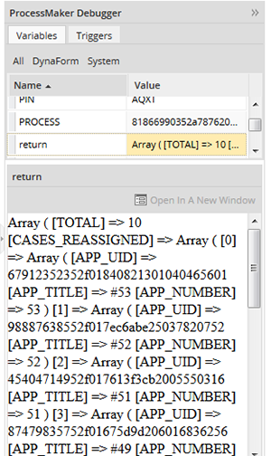 Click on Submit button, and if you have the debugger enabled, inside the return variable, you will see the number of reassigned cases and their corresponding information: