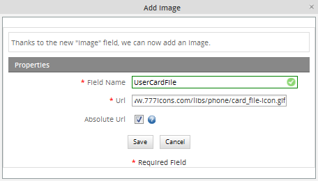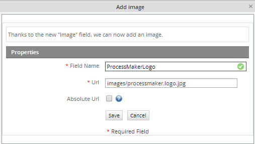 The image field allows users to view images inside Dynaforms, such as a company logo or a user's profile picture.