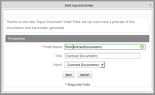 Note: A Document Viewer field may only display the last file which was uploaded to the Input Document. If needing to access more than one file from an Input Document, then use a Input Document View field.