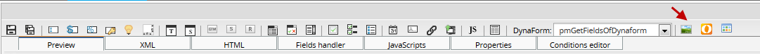 To use one of these additional fields, open a process for editing, go to the DYNAFORMS tab and open a DynaForm for editing. Look for the 3 fields in the upper-right corner of the DynaForm toolbar: