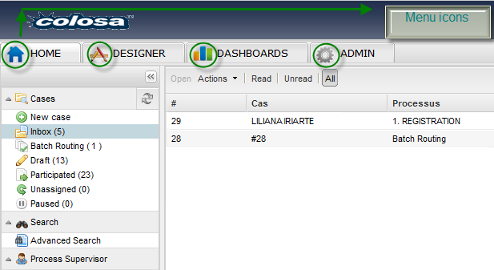 - Simplified: Users can have a simplified view of the ProcessMaker interface, viewing only the inbox where their incoming cases are listed with an overview of the information surrounding the case such as; name and number of the case, person in charge, date of the case, name of the form and the process it belongs to.