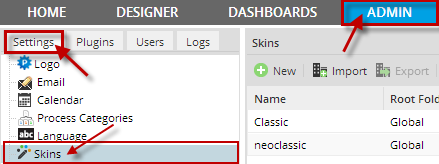 By default, the "neoclassic" skin is applied when ProcessMaker is installed. To change this skin go to ADMIN > Settings >Skins and all available skins will be listed, double click on the skin to apply it, this functionality is available from version 2.0.45.