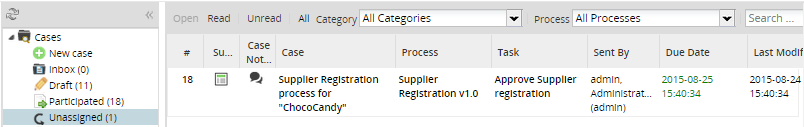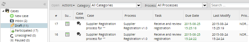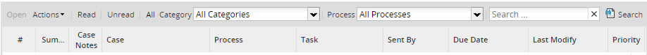- The following columns can be ordered (ascending and descending): #, Case, Process, Last Modify (the last modification of the application), Priority (the maximum priority assigned to a case in the application).