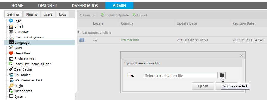 To add a new existing translation, login into ProcessMaker as the admin user (or any other user with PM_SETUP_ADVANCE in their role) go to ADMIN > Settings > LANGUAGES and click on Install/Update, a window will open click on the folder icon to search the .po file on the local computer