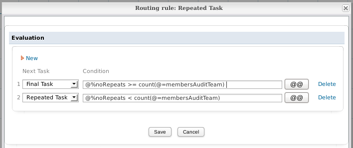 If the "Repeating Task" needs to have the possibility of not being executed at all (for example, there a zero members in the "Audit Team"), then an evaluation routing rule needs to be added before the "Repeating Task" to skip it.