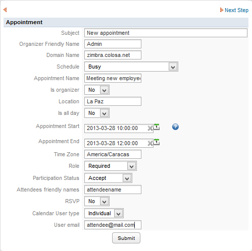 createZimbraAppointment(): Creates an appointment on Zimbra environment.