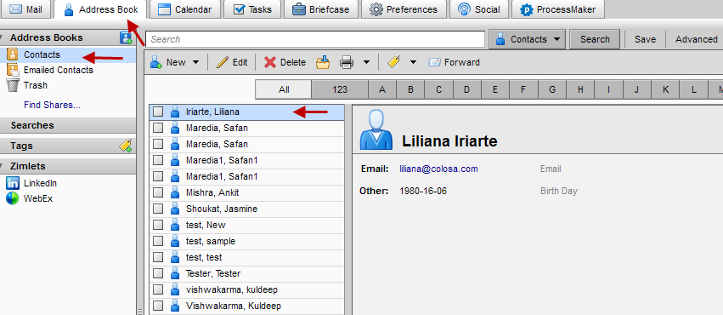To check if the contact was actually created or not, login to Zimbra Webserver using the credentials and Click on AddressBook Tab you can see the contact with the attributes set in the Trigger, on the Main Content Area.