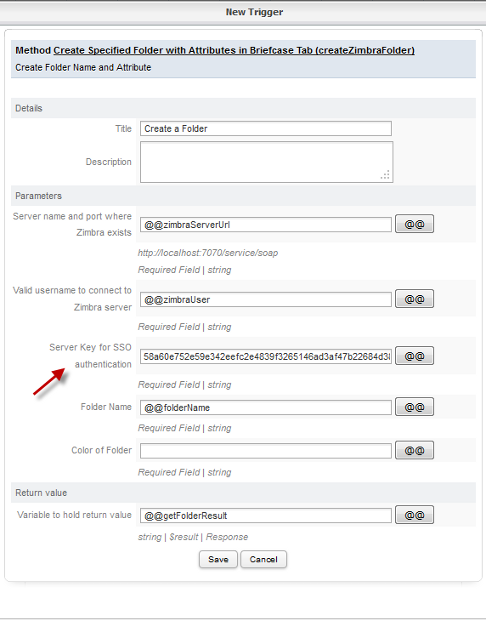 - To check if the folder is actually created or not, login to Zimbra Webserver using the credentials and click on Briefcase Tab you can see the folder with the name and color you selected in the Trigger, on the Right Panel.