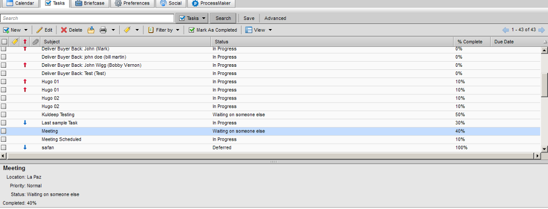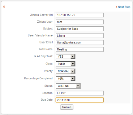 To check if the contact is actually created or not, login to Zimbra Webserver using the credentials and Click on Task Tab you can see the task with the attributes you set in the Trigger, on the Main Content Area.