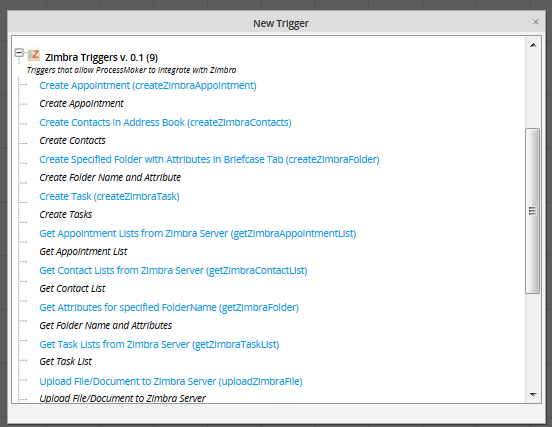 uploadZimbraFile(): It uploads a file from a Process created on ProcessMaker to the Zimbra Environment.